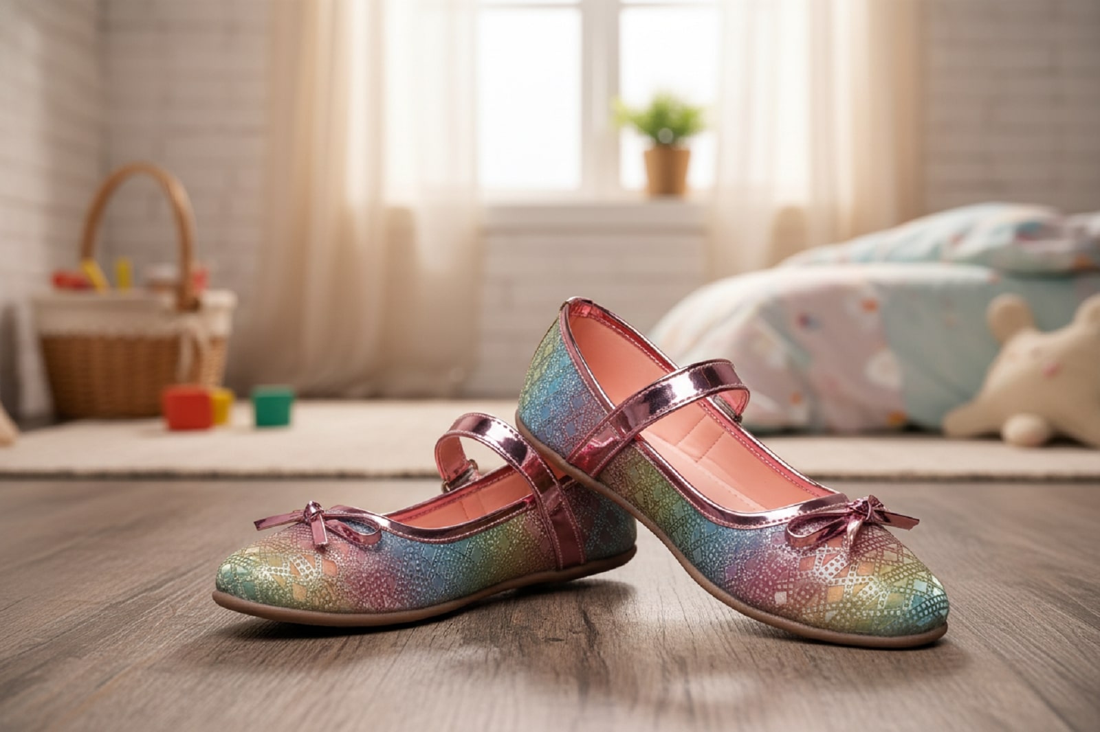 A charming floral-patterned Mary Jane shoe with a delicate bow, set in soft natural light.