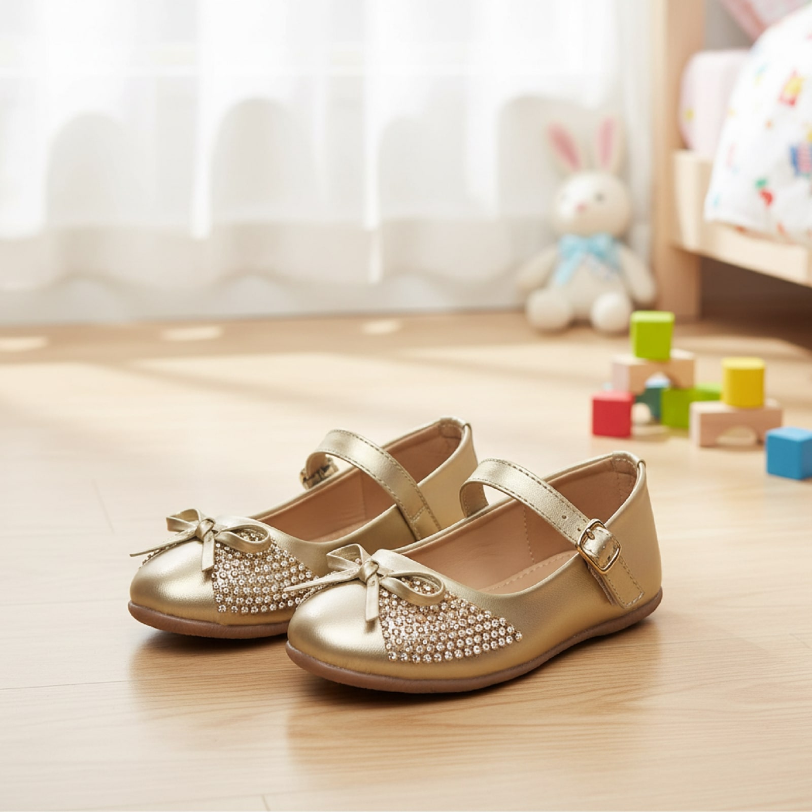 A charming floral-patterned Mary Jane shoe with a delicate bow, set in soft natural light.